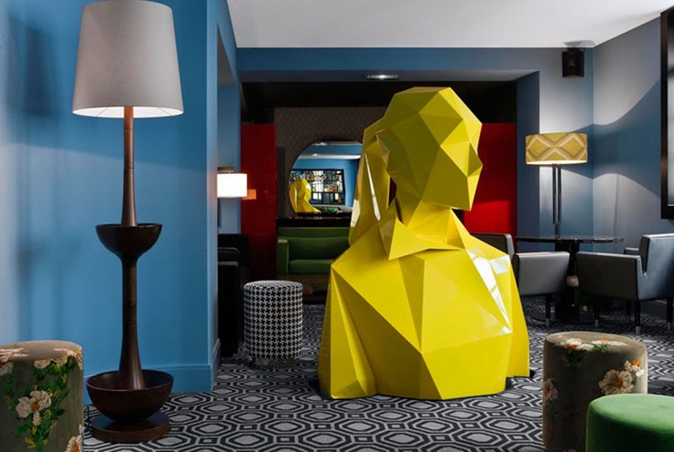 In collaboration with Thierry Costes, India Mahdavi reveals her first public project in Paris. The Germain opened its doors to the public in May of 2009 – it revives the Parisian bistro creatively and recreationally with a pixelated floor, composed of black and white cement tiles, and a graphically illuminated ceiling. Anis green and orange tones float around Sophie, a 5-meter yellow metal statue by Xavier Veilhan. ‘i wanted this place to have a history and a tradition but also to be able to free itself from it. I deconstructed the space by experimenting with scale, proportions and patterns.’ affirms India Mahdavi.